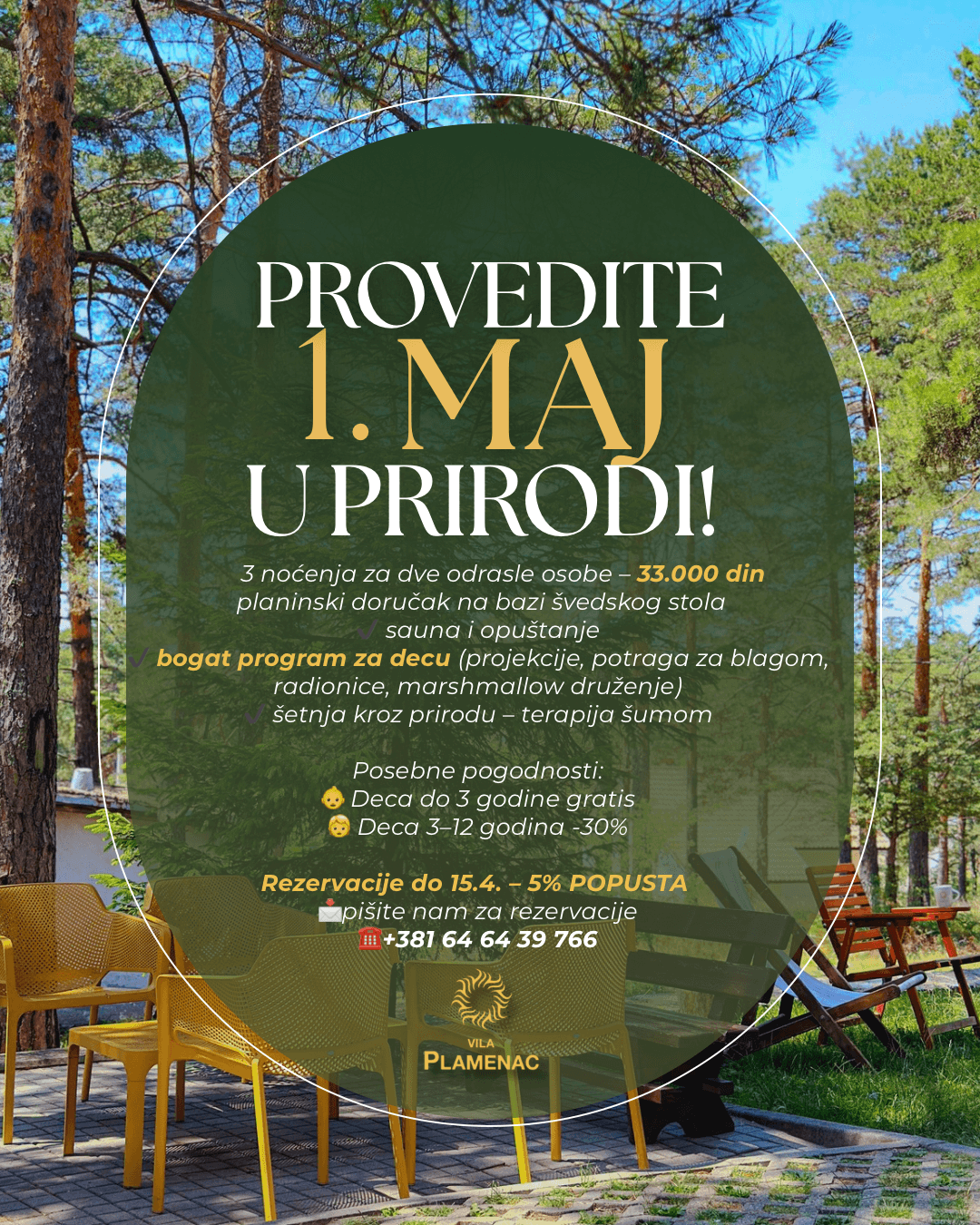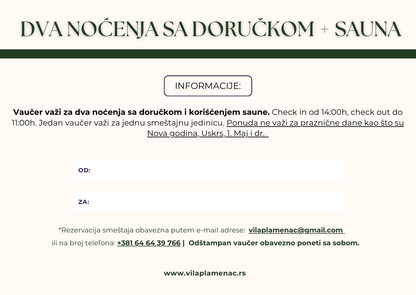 Vaučer Vam omogućava da iskusite nezaboravan boravak u Vili Plamenac, na čarobnim Divčibarama, gde priroda, udobnost, planinski vazduh i mir stvaraju savršenu oazu za odmor. Dobro nam došli!