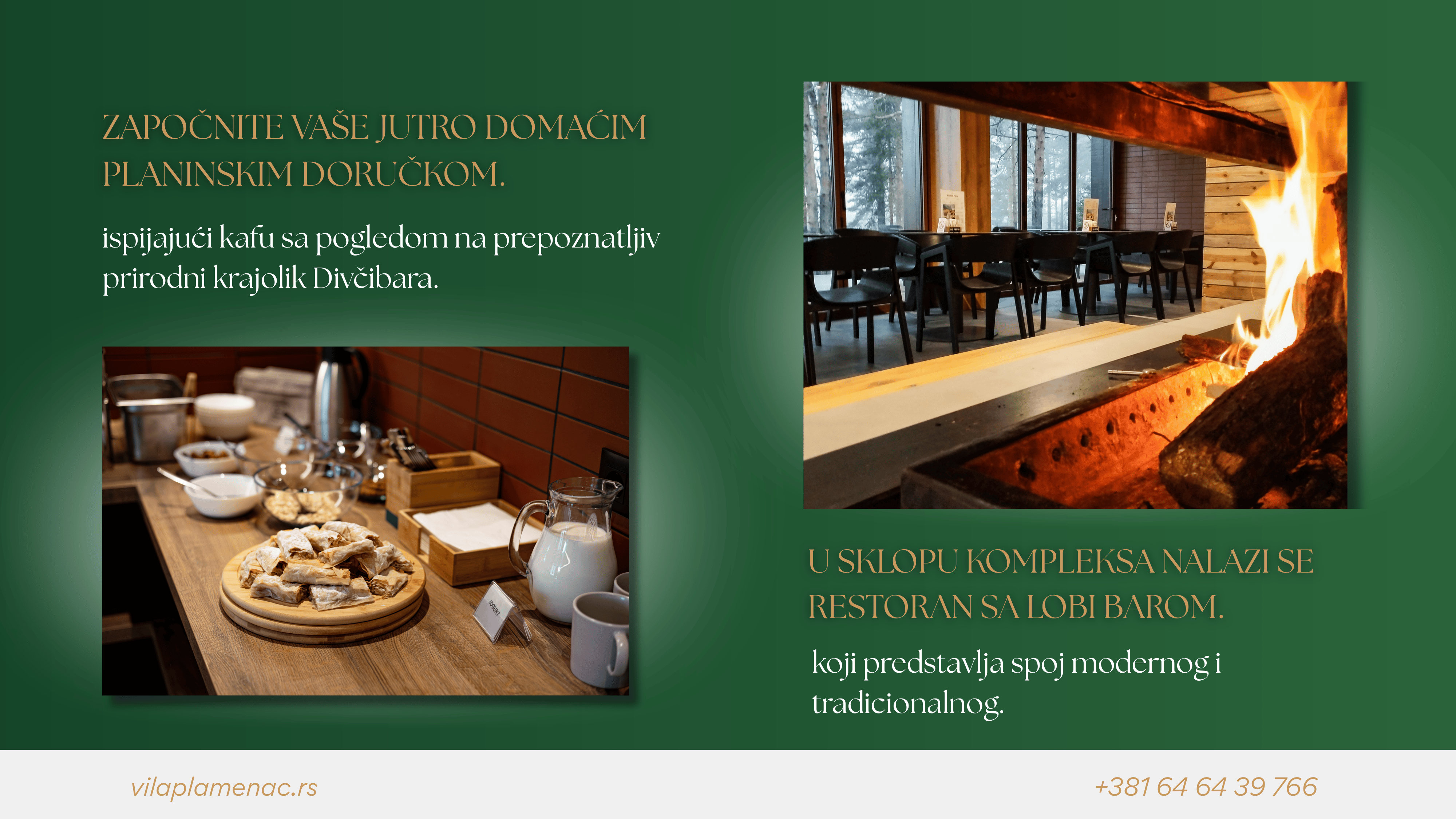 Započnite vaše jutro domaćim planinskim doručkom, ispijajući kafu sa pogledom na prepoznatljiv prirodni krajolik Divčibara. Naš restoran sa svojim barom predstavlja spoj modernog i tradionalnog.